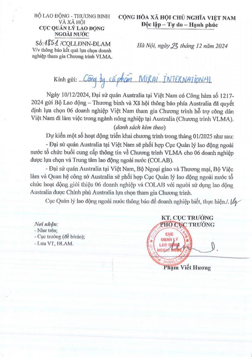 MIRAI INTERNATIONAL được Úc lựa chọn thực hiện chương trình VMLA Bài viết quan tâm Cảnh báo về tình trạng lừa đảo nhằm vào người lao động Khảo sát về nhu cầu tham gia visa 403 ngành nghề nuôi bò Úc! Khảo sát nhu cầu tham gia visa 403 ngành thu hoạch chanh dây và đu đủ! Khảo sát về nhu cầu tham gia visa 403 ngành pha, lóc thịt bò! Khảo sát về nhu cầu tham gia chương trình visa 403 ngành chăn nuôi lợn Khảo sát về nhu cầu tham gia chương trình visa 403 ngành nghề bắt gà Khảo sát về nhu cầu tham gia chương trình visa 403 - thu hoạch chuối Giả mạo giấy tờ, con dấu của Công ty Cổ phần Mirai International Visa 403 Úc : Vấn đề mạo danh Công ty CP Mirai International MIRAI INTERNATIONAL được Úc lựa chọn thực hiện chương trình VMLA ĐƠN HÀNG ĐI NHẬT PHÍ 0 ĐỒNG Những kiến thức cần thiết để tránh gặp rắc rối Hành lý đồ dùng cần mang theo khi sang Nhật Điều kiện cần cho lao động để đi XKLĐ Nhật 2022 Thực tế công việc làm vệ sinh tòa nhà tại Nhật Bản thế nào? Nét văn hóa đặc sắc của người Nhật JLPT là gì? Thông tin mới về kỳ thi năng lực tiếng Nhật JLPT Tư cách lưu trú tại Nhật Bản là gì ? KINH NGHIỆM PHỎNG VẤN THỰC TẬP SINH NHẬT BẢN Xuất khẩu lao đông Nhật Bản - Điều cần biết
